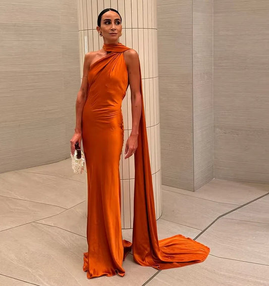 Luxury Satin One-Shoulder Cape Train Mermaid Evening Dress for Red-Carpet Events, Gala Dinners & Destination Weddings