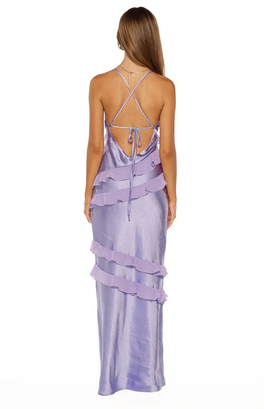 Chic Lavender Satin V-Neck Tiered Ruffle Lace-Up Back Floor Length Mermaid Prom Dress