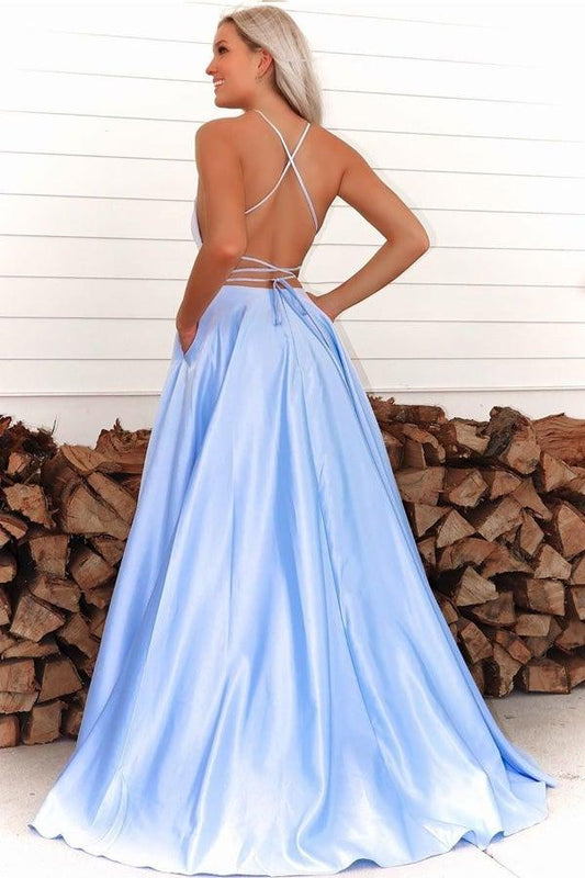 Elegant ball gown square neck spaghetti-strap cross-back slit satin prom dress